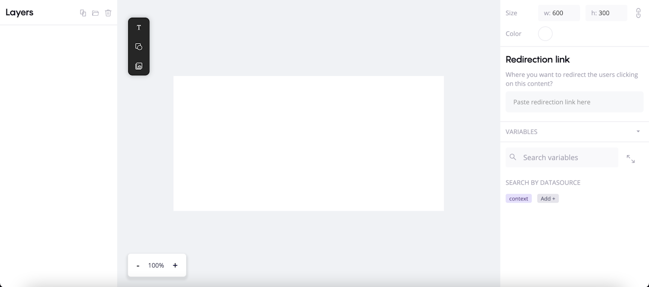 - A panel containing configuration options for the canva (size & background color) and for the redirection link of your visual.