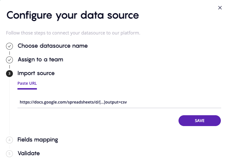 - Copy the URL you saved from Google Spreadsheet (step 2) in "Import source".