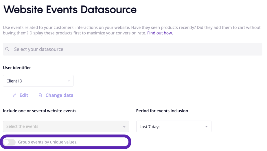 The Group By feature is available for the Website Events and Product Datasources data nodes.