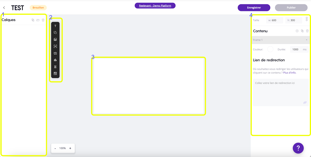 A droite, des options de configuration pour le contenu (taille / couleur de fond) et pour le lien de redirection de votre visuel. (4)